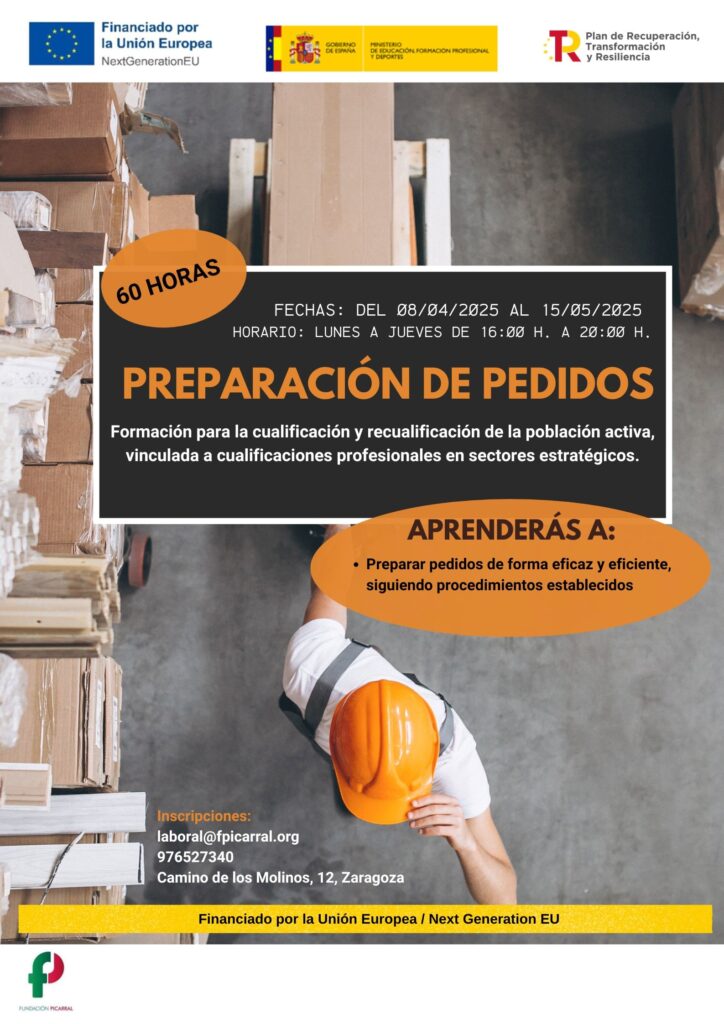 Continuando con el programa de cualificación y recualificación de la población activa, y en el marco del Mecanismo de Recuperación y Resiliencia (MRR) y del Plan de Recuperación, Transformación y Resiliencia (PRTR), Fundación Picarral lanza una nueva línea de formación gratuita en operaciones auxiliares de almacén, preparación de pedidos y logística de distribución.